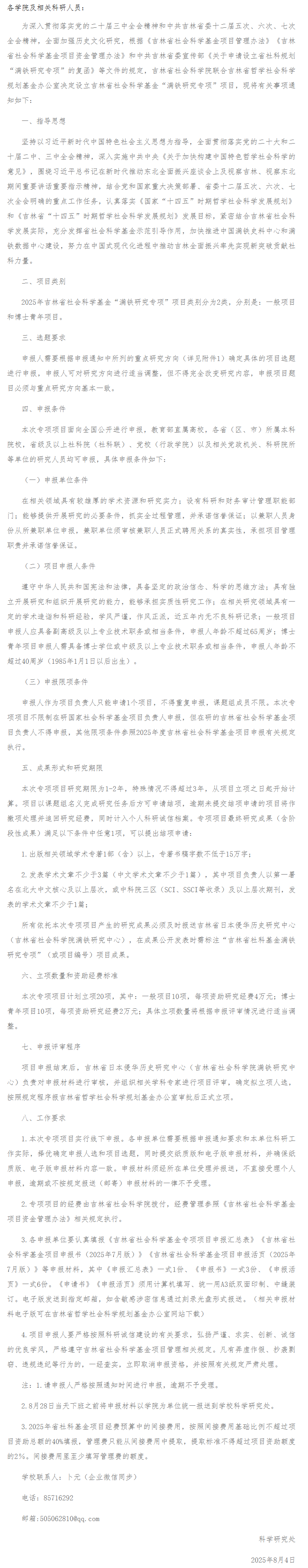 关于做好2025年度吉林省社会科学基金“满铁研究专项”项目申报工作的通知